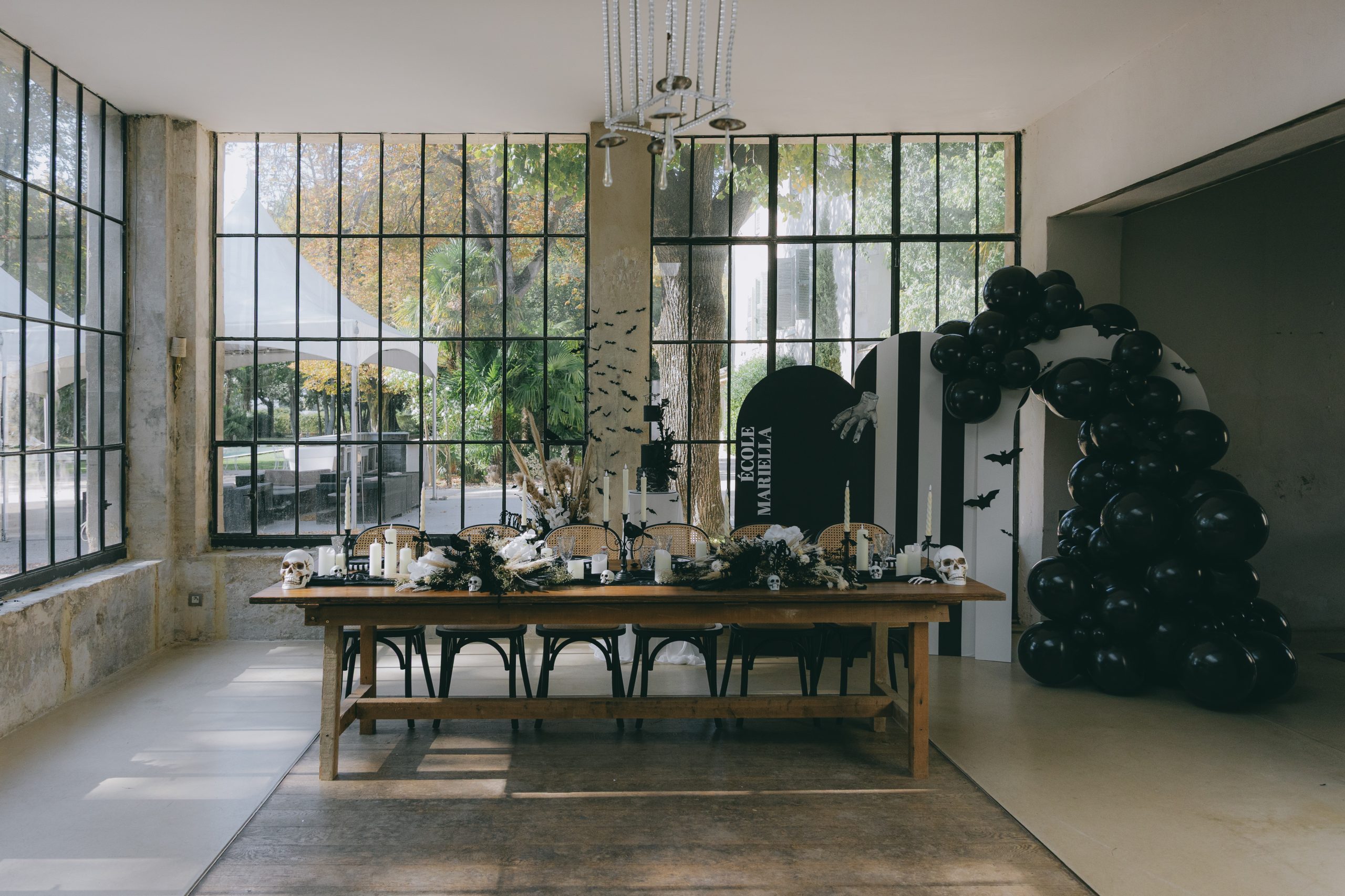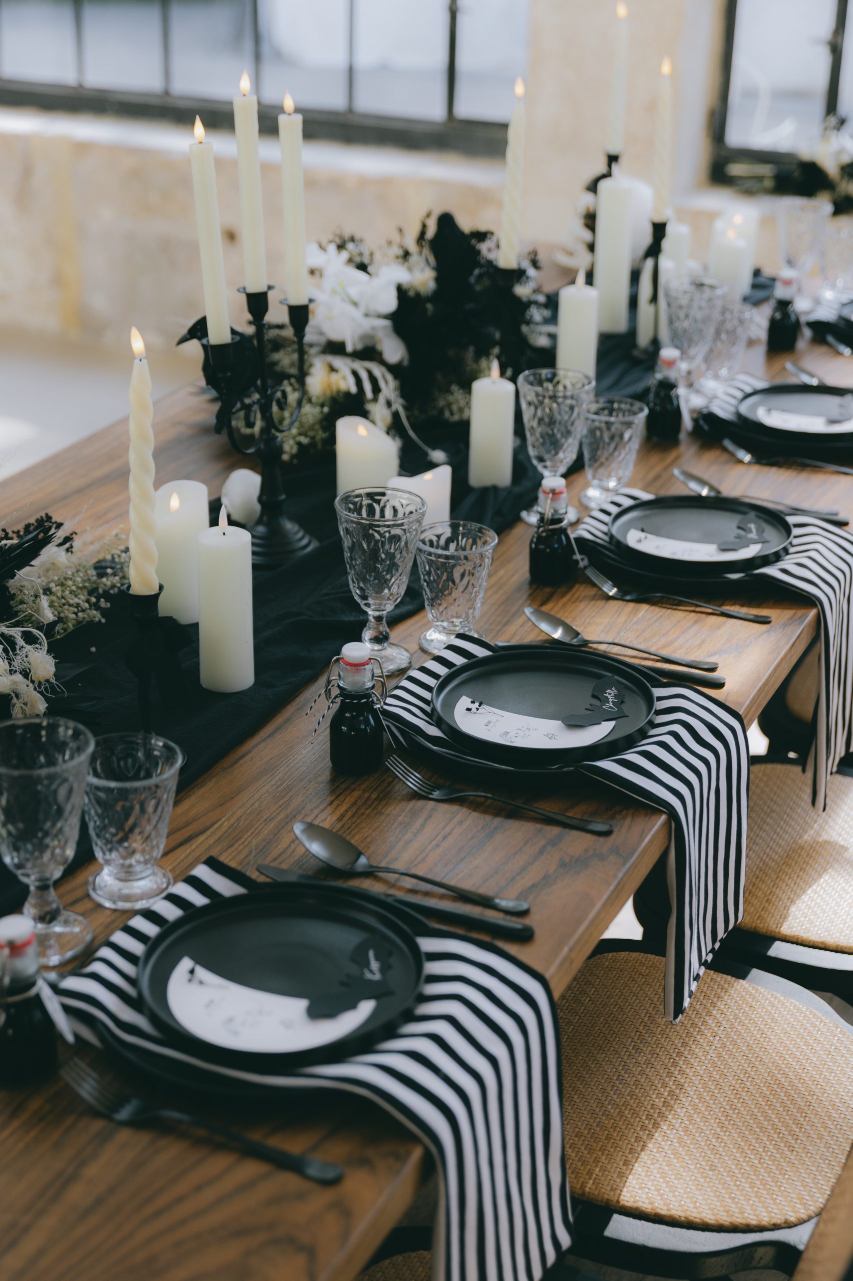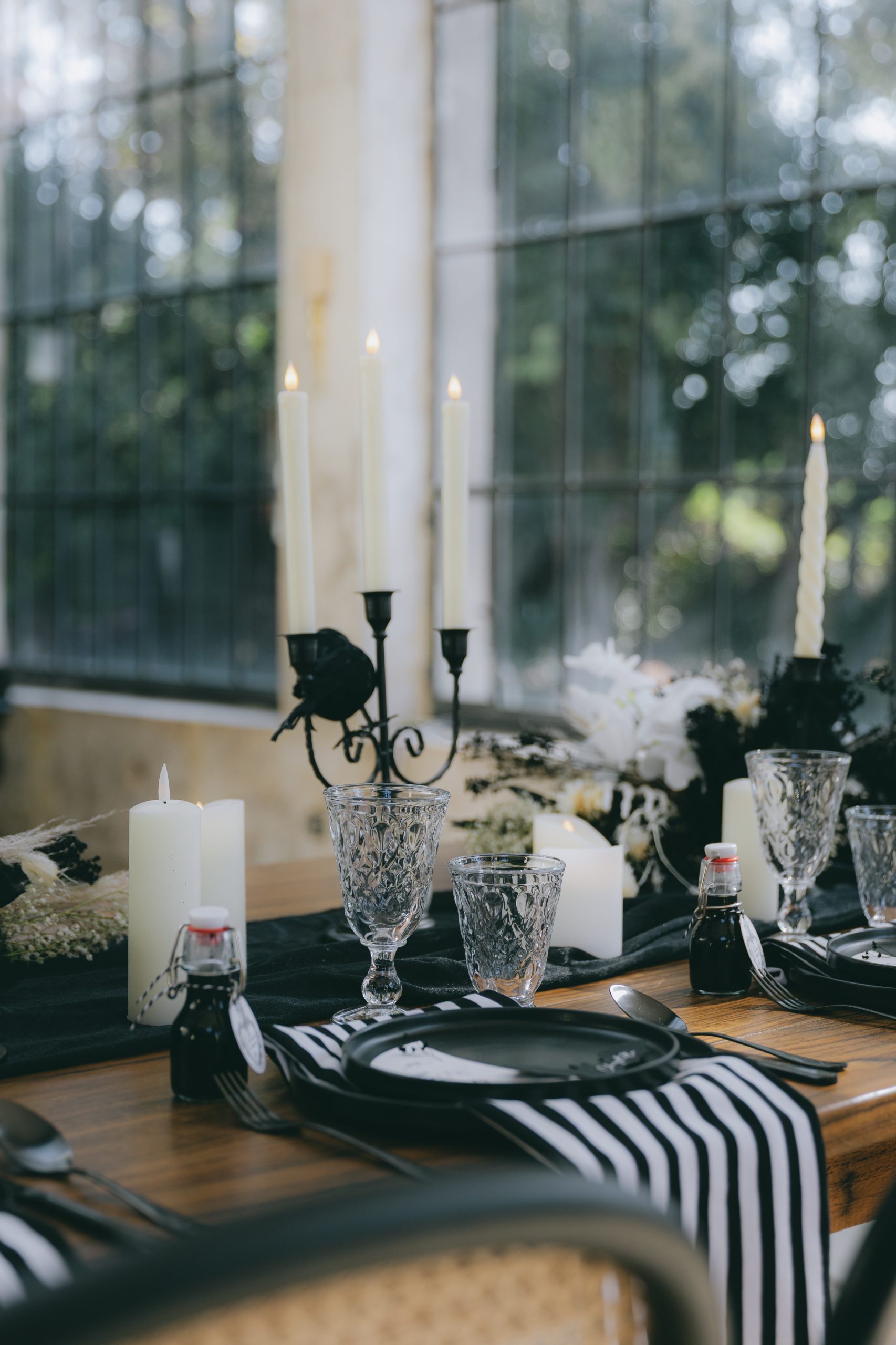 chandeliers et bougies diffusant une lumière tamisée, compositions florales sombres et séchées, vaisselle noire graphique, verrerie sculptée, textiles rayés contrastés… Chaque élément affirme un style audacieux, immersif et parfaitement maîtrisé.