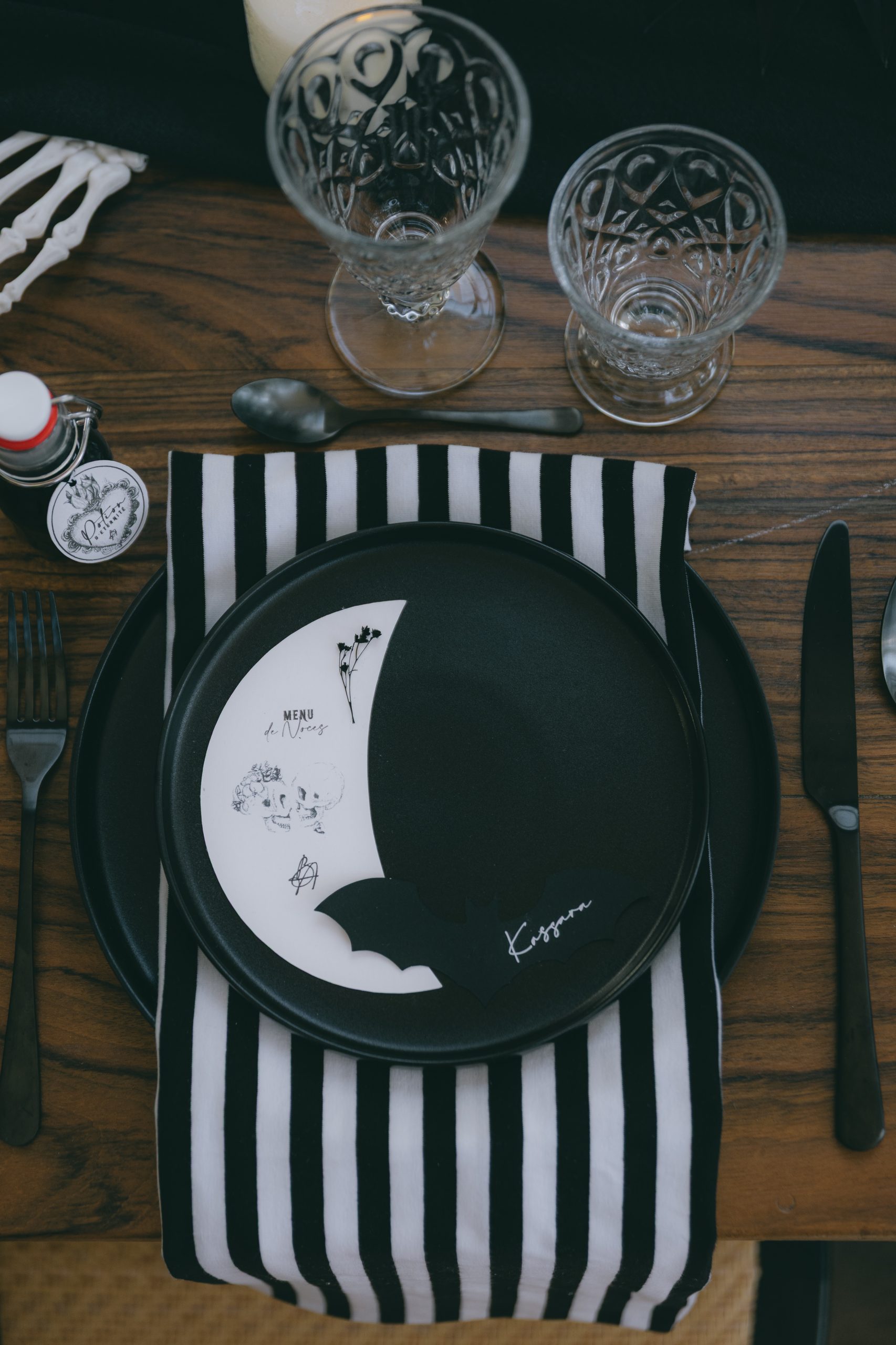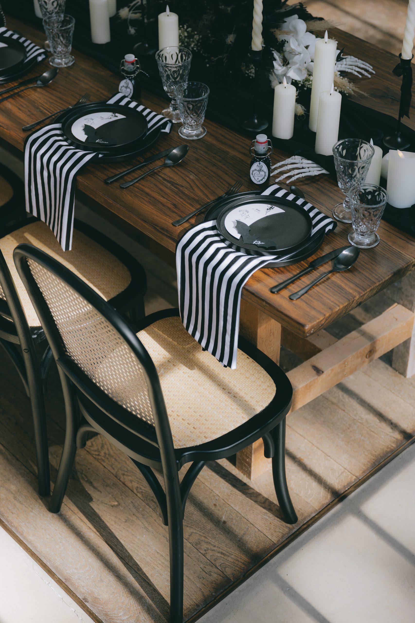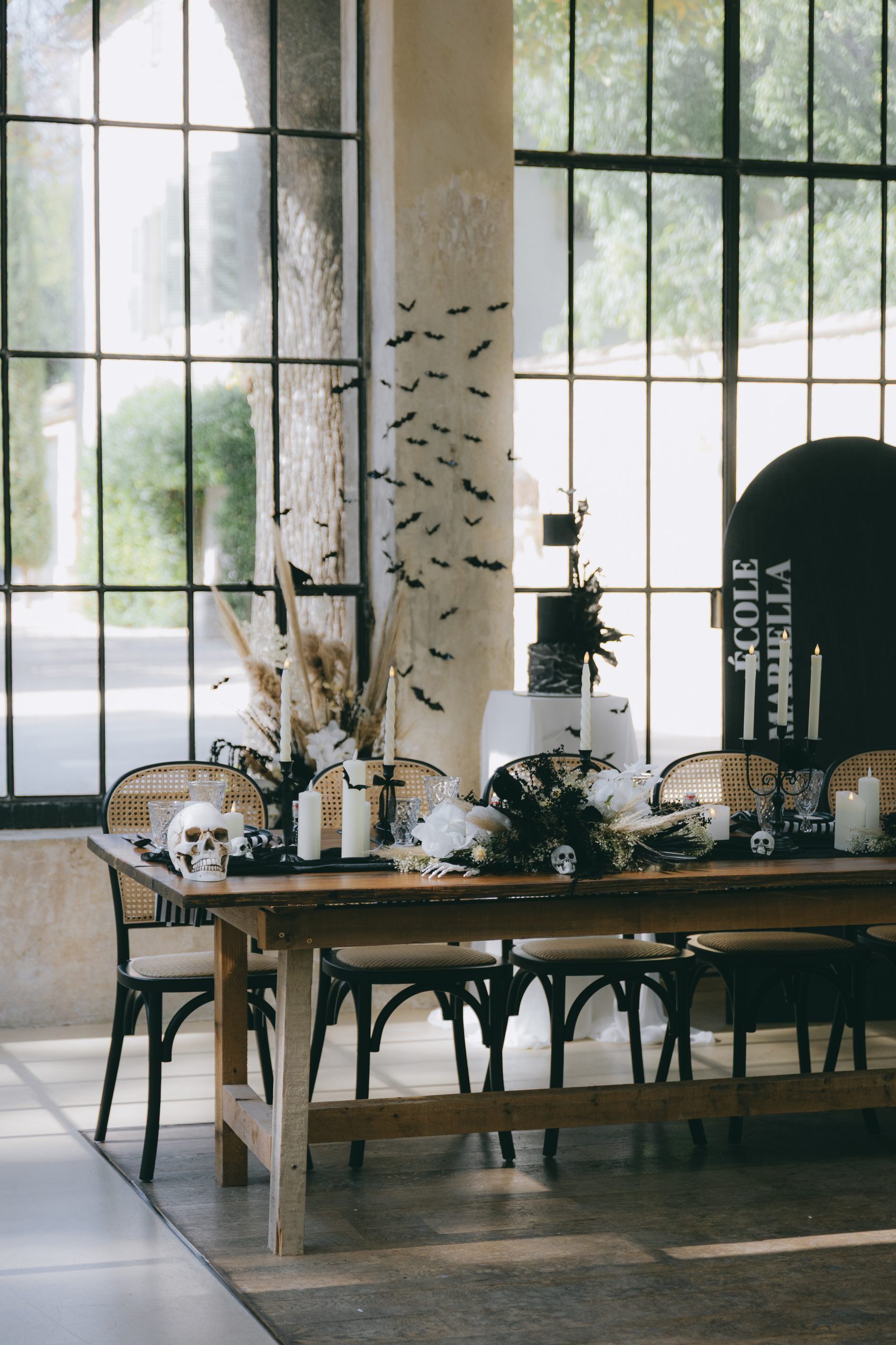 chandeliers et bougies diffusant une lumière tamisée, compositions florales sombres et séchées, vaisselle noire graphique, verrerie sculptée, textiles rayés contrastés… Chaque élément affirme un style audacieux, immersif et parfaitement maîtrisé.